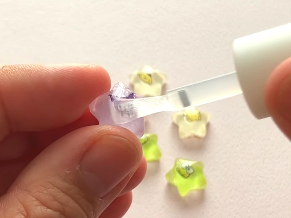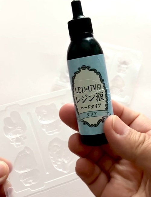 グミの容器にレジン液を流しこんでライトで硬化します