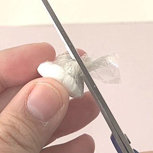 粘土をラップで包み、要らないところをはさみでカットします